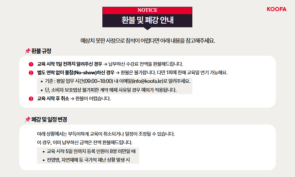 ▶비영리 : 고유번호증 가운데 자리가 80, 82, 83, 89번 중 하나인 경우 ▶맞춤교육 문의 : 02-562-8220 / info@koofa.kr ▶교육개시 하루 전날 또는 당일 신청은 1:1문의나 전화로 연락주시기 바랍니다.