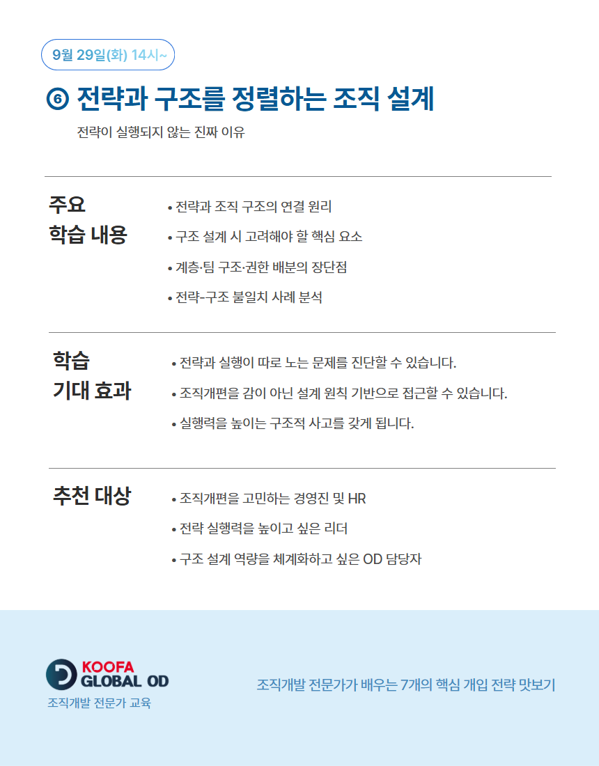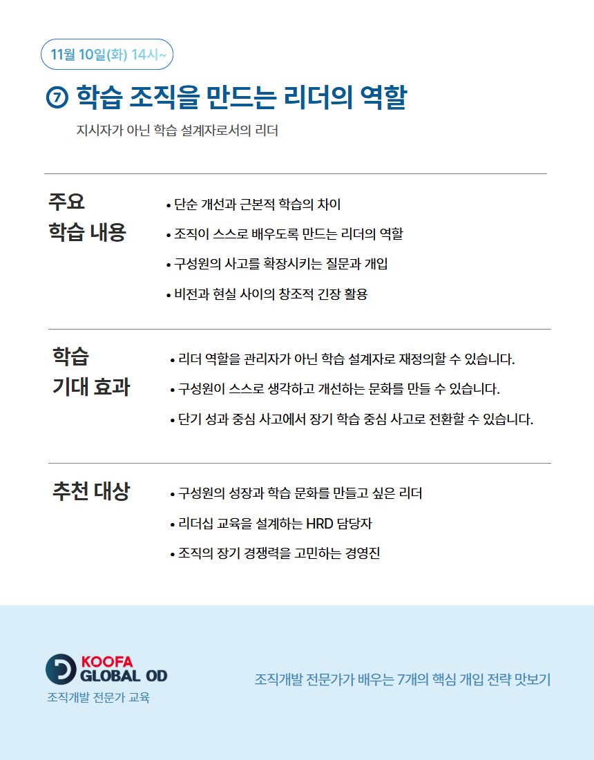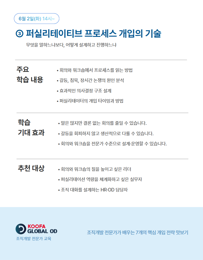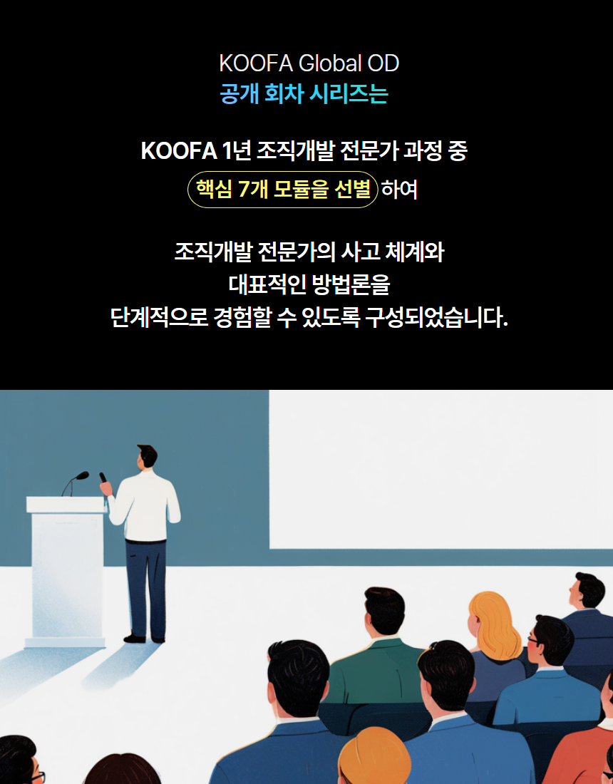 이 페이지는 KOOFA Global OD 정규 과정 중 외부 수강생도 함께 참여할 수 있는 '공개 회차'를 안내하고 신청받는 공간입니다. 자세한 공개 회차의 정보는 아래 이미지를 확인해주세요.