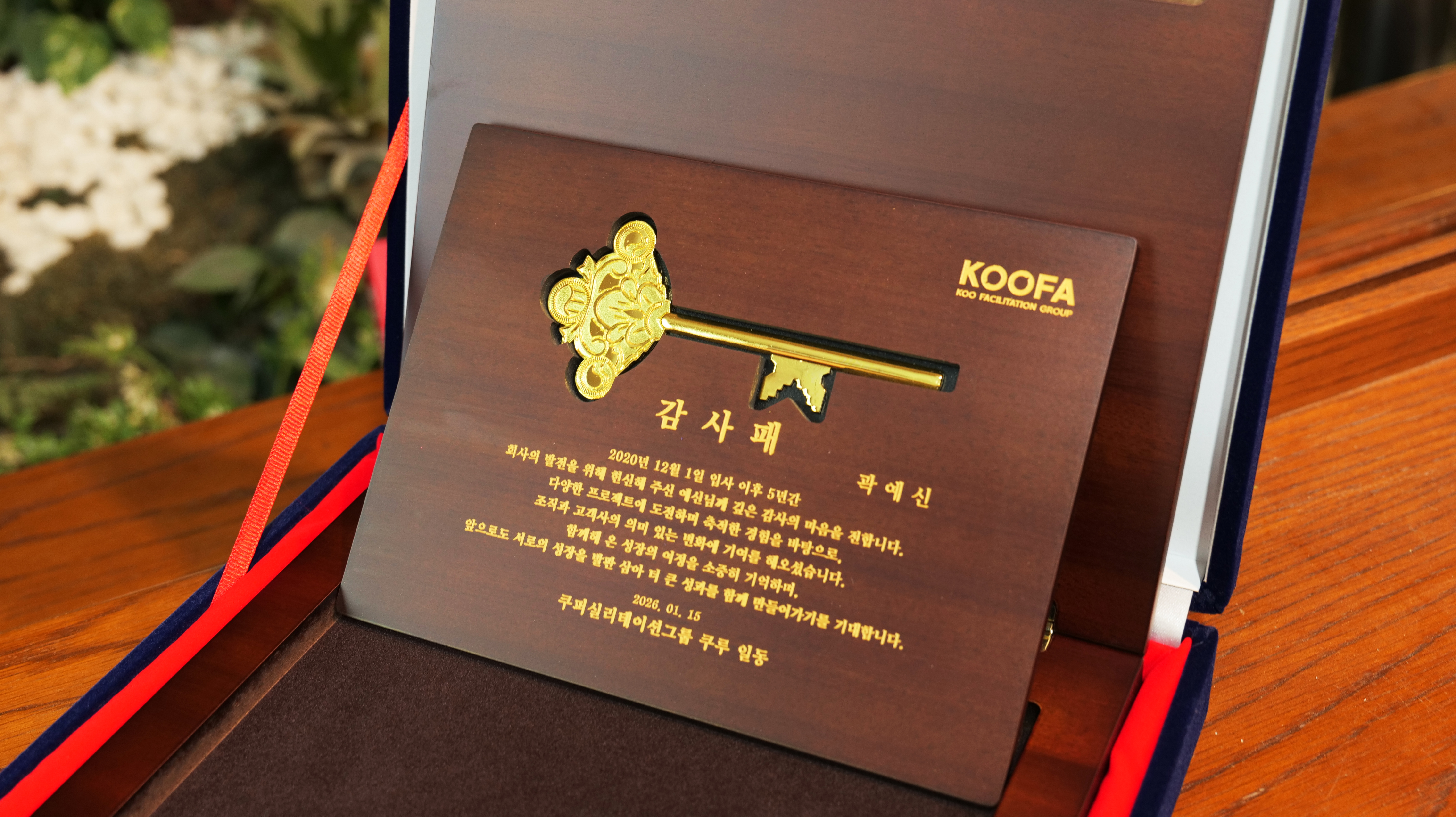 KOOFA 구기욱 대표가 5년 장기근속 직원인 곽예신 선임컨설턴트에게 황금열쇠 5돈과 감사패를 수여하고 있다.